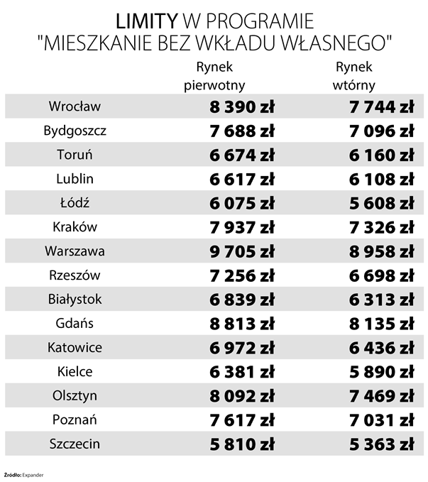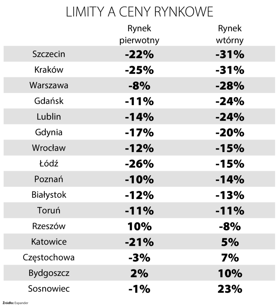 Najgorzej sytuacja ma się w Krakowie i Szczecinie gdzie limit ceny m. kw. mieszkania na rynku wtórnym są według obliczeń Jarosława Sadowskiego, głównego analityka Expander Advisors, o 31% niższe od cen rynkowych.